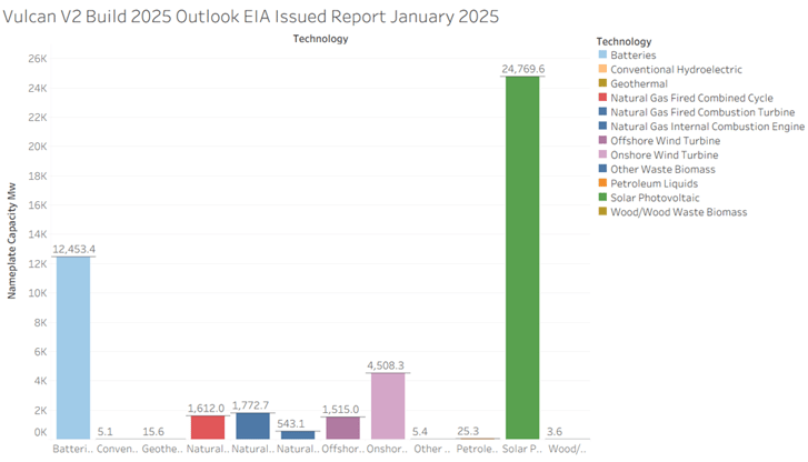 With the year-end EIA 860M data now released, we can evaluate how the EIA's projections compared to the Vulcan V2forecast for 2025. The January 2025 report (published in late February)projected that 61 GW would come online over the year.