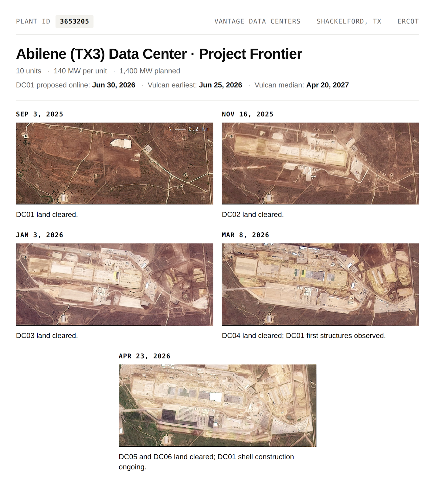 DC01's proposed online date is June 30, 2026. Land clearing was observed on September 3, 2025 and first structures on March 3, 2026. As of April 23, 2026 the building shell remains under construction. Construction progress is inconsistent with a June 2026 online date and our median online estimate for DC01 is April 20, 2027.