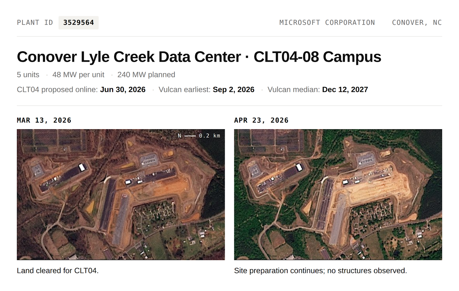 CLT04 remains at the land clearing stage, with site preparations beginning on March 13, 2026 and no vertical structures observed as of April 23, 2026. Current progress is inconsistent with the proposed June 30, 2026 online date and our median online estimate for this first unit is December 12, 2027.