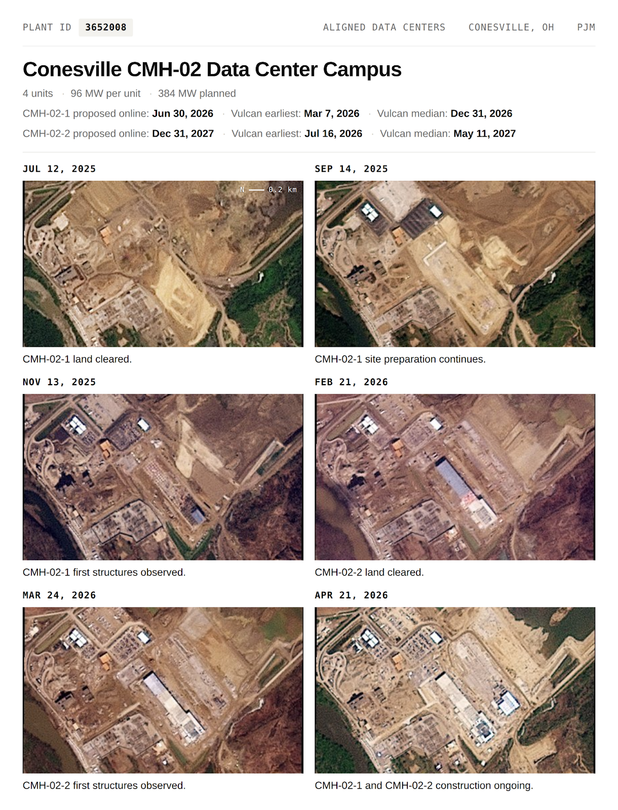 The campus shows divergent pace across its two active units. CMH-02-1 was land cleared on July 12, 2025 with first structures on November 13, 2025 against a proposed online date of June 30, 2026; construction progress is inconsistent with this timeline, and our median online estimate is December 31, 2026. CMH-02-2 was land cleared on February 21, 2026 with first structures on March 24, 2026 against a proposed online date of December 31, 2027; construction progress appears accelerated, with our median online estimate of May 11, 2027.